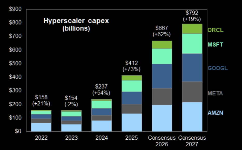 El gasto de los hiperescaladores de IA alcanzará un total de 667 mil millones de dólares en 2026.